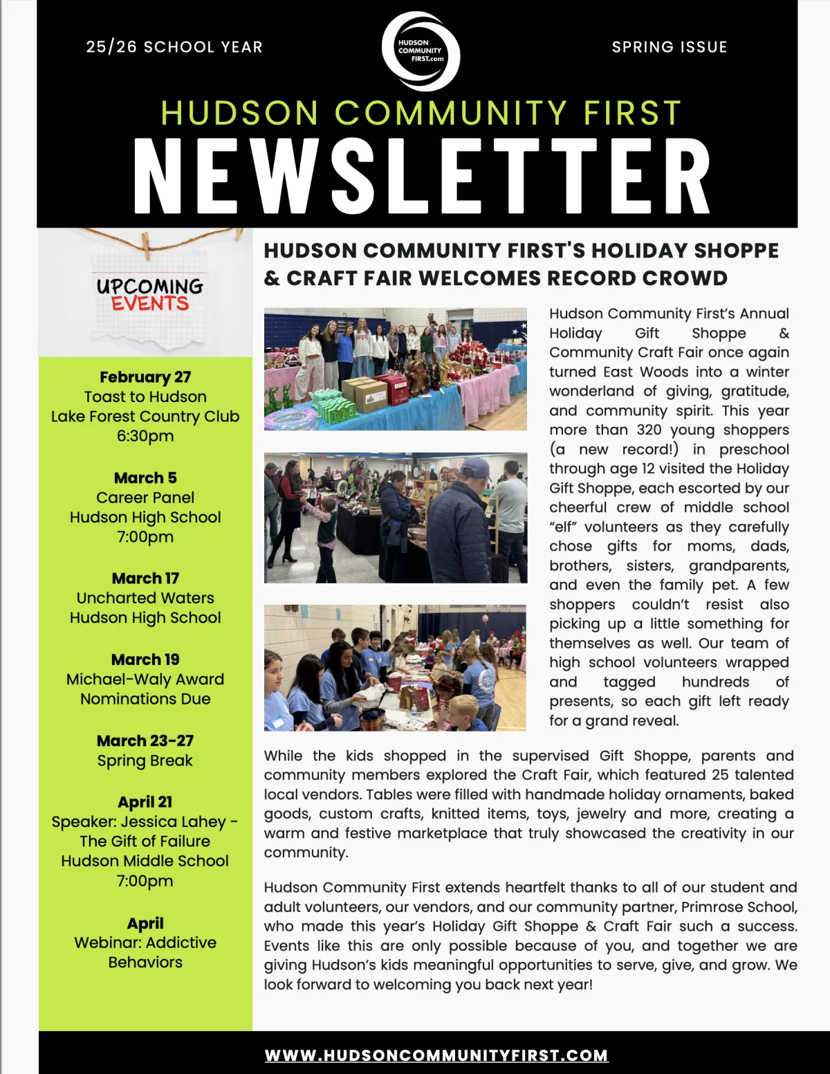 Keep up-to-date on all the amazing programs and events happening through Hudson Community First! Subscribe to our seasonal newsletter!